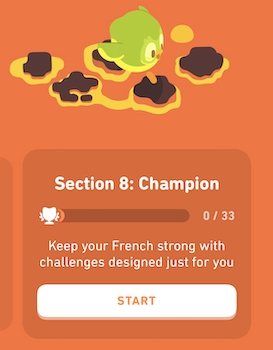 I'd completed the entire Duolingo French tree. Yes, I'd gotten to the end of Duolingo French. I was noodling through the "Champion" Section 8, feeling like a fraud. You'd think I was now fluent, but I knew perfectly well I was not. I could tell that my French language skills had stalled out, that I was stuck on a plateau of Perpetual French Intermediateness. But it worse than that: somehow the app seemed to be dissolving my previous knowledge of verb tenses and grammatical subtleties.