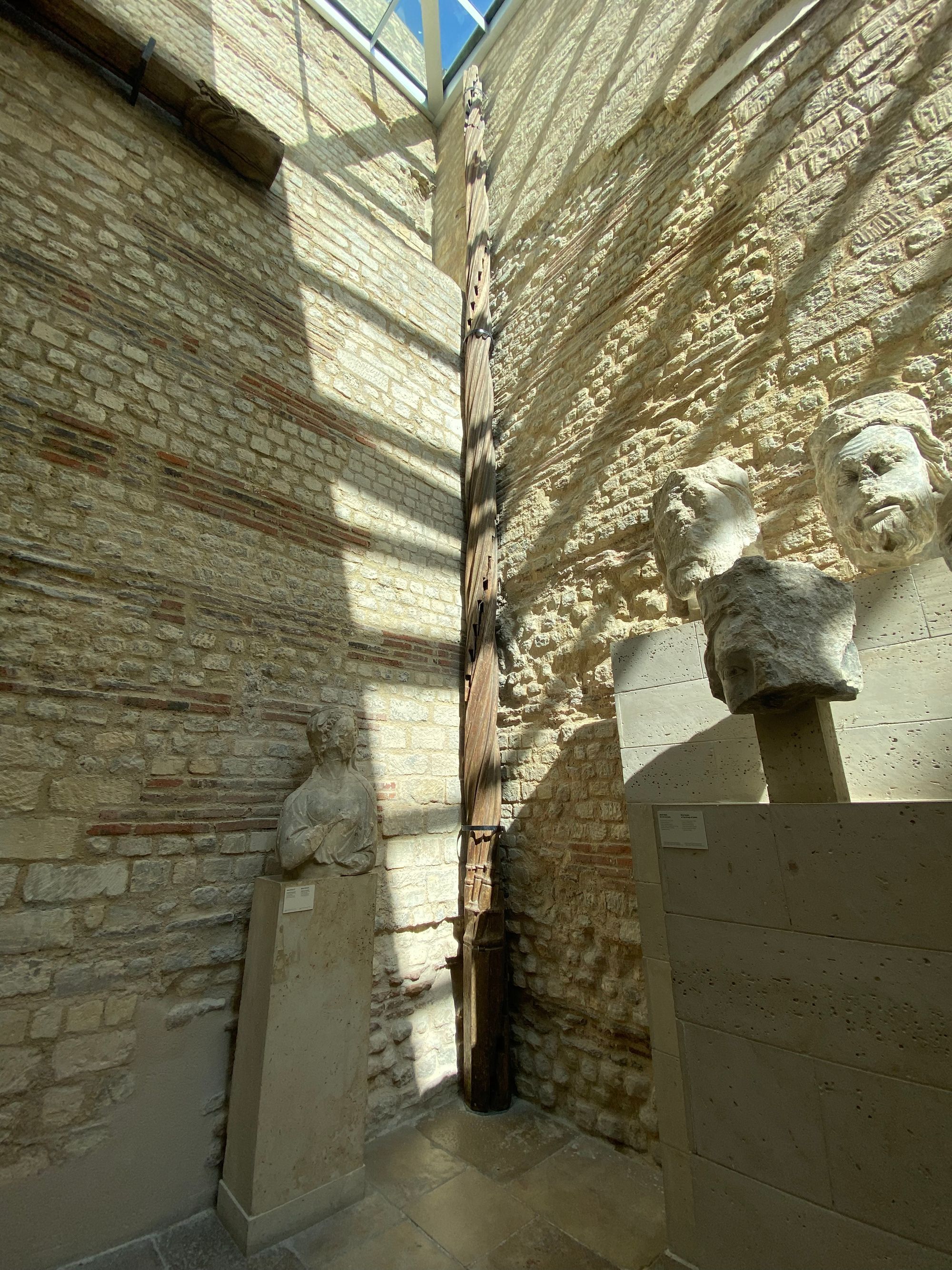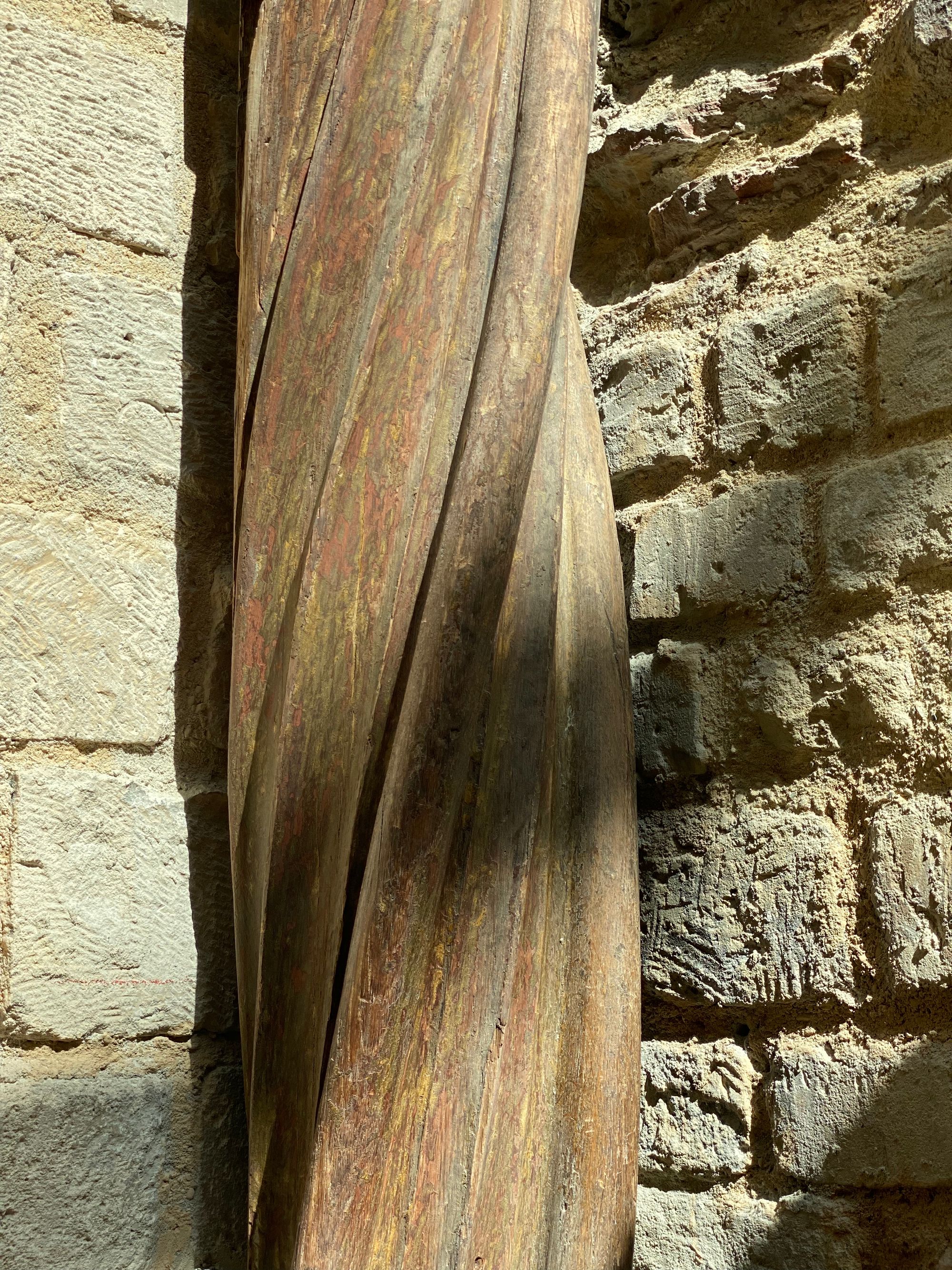 Our house dates to around 1800, but these tightly wound spiral staircases featuring twisting, pillar-like banisters are found throughout Europe, often in places much older than the Enlightenment. They are vestigial design elements hailing from medieval castles, where a tower's stairs usually lead counter-clockwise on the descent, based on the idea that a soldier wielding a sword in his right hand would have more room to fight off any unwelcome foes climbing upward. As for our distinctive spiral banister, this summer we spotted a similar but much older one at my favorite museum in Paris, the Musée de Cluny, devoted to Medieval art in France and Europe, where it's propped against the corner of one exhibition hall: