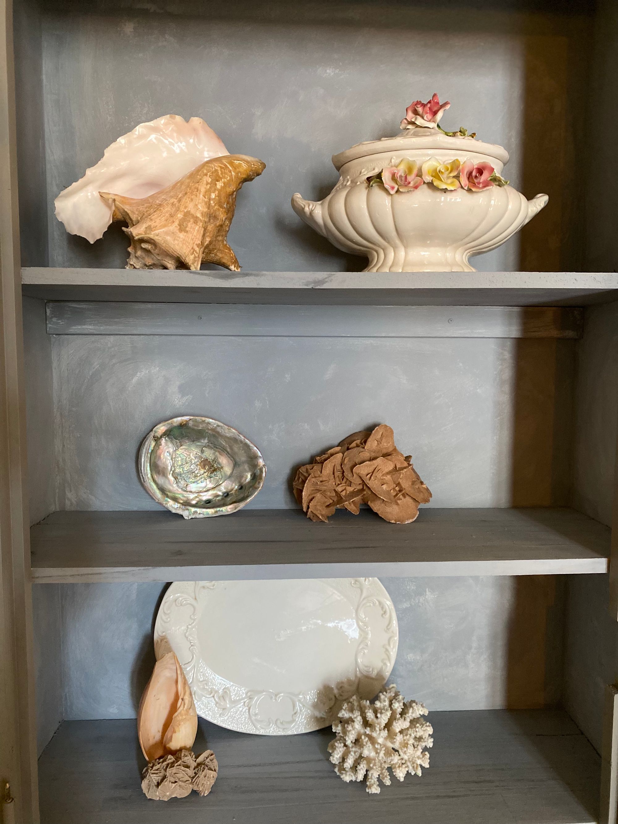 We are a coast-loving family who've collected a good number of beach-combed seashells over the years. We felt immediately at home in Brittany's long but narrow Atlantic peninsula, where the sea is never far from anywhere. From the France House in Dinan, the Emerald Coast is about 15 miles away, and we collect a seashell or two every time we visit a beach. But it was the decorator we'd hired in Brittany who brought us some gorgeous showpiece seashells for the salon's shelves, along with antique French porcelain, North African sand-roses (delicate desert gems I used to hunt for as a kid in Saudi Arabia), and white coral; we added in an opalescent abalone shell, native to our Northern California coasts. I love how these Breton, Saharan, and Californian natural pieces are mixed in with nature-inspired French objets: