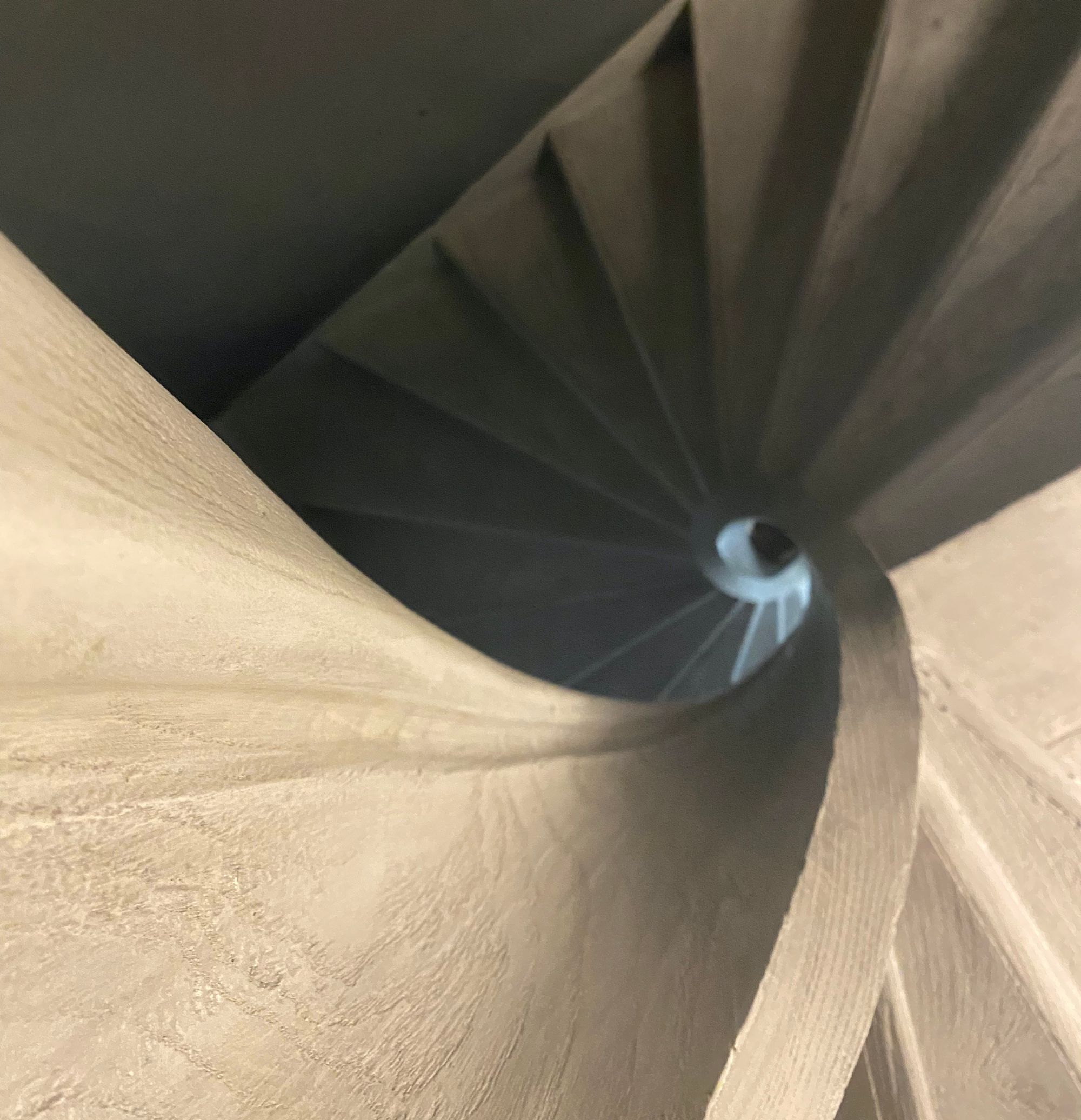 On the France House's spiral staircase—a shape shared by Breton and Celtic symbolism, the structure of seashells and the Fibonacci sequence, and the winding cycles of adult life.